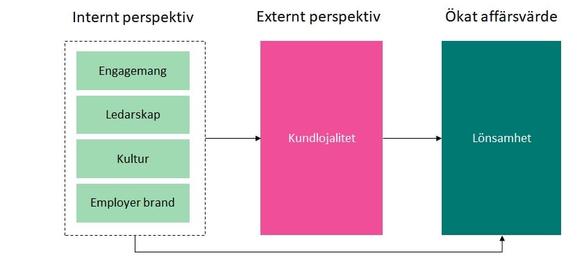Här ser man vilken tydlig roll HR har i kedjan. Sambandet mellan vad medarbetarna tycker om bolaget och hur kunderna upplever bolaget ger information om affärsvärdet. Resultatet kommer visa hur personalen trivs på jobbet, och deras engagemangsnivå, påverkar kundlojaliteten – och det är därför viktigt att använda sig av siffror från medarbetarundersökningar och kundnöjdhetsundersökningar för att kunna analysera fram de sista siffrorna. Gissa inte, använd fakta. Här kan du läsa med om The Service Profit Chain.